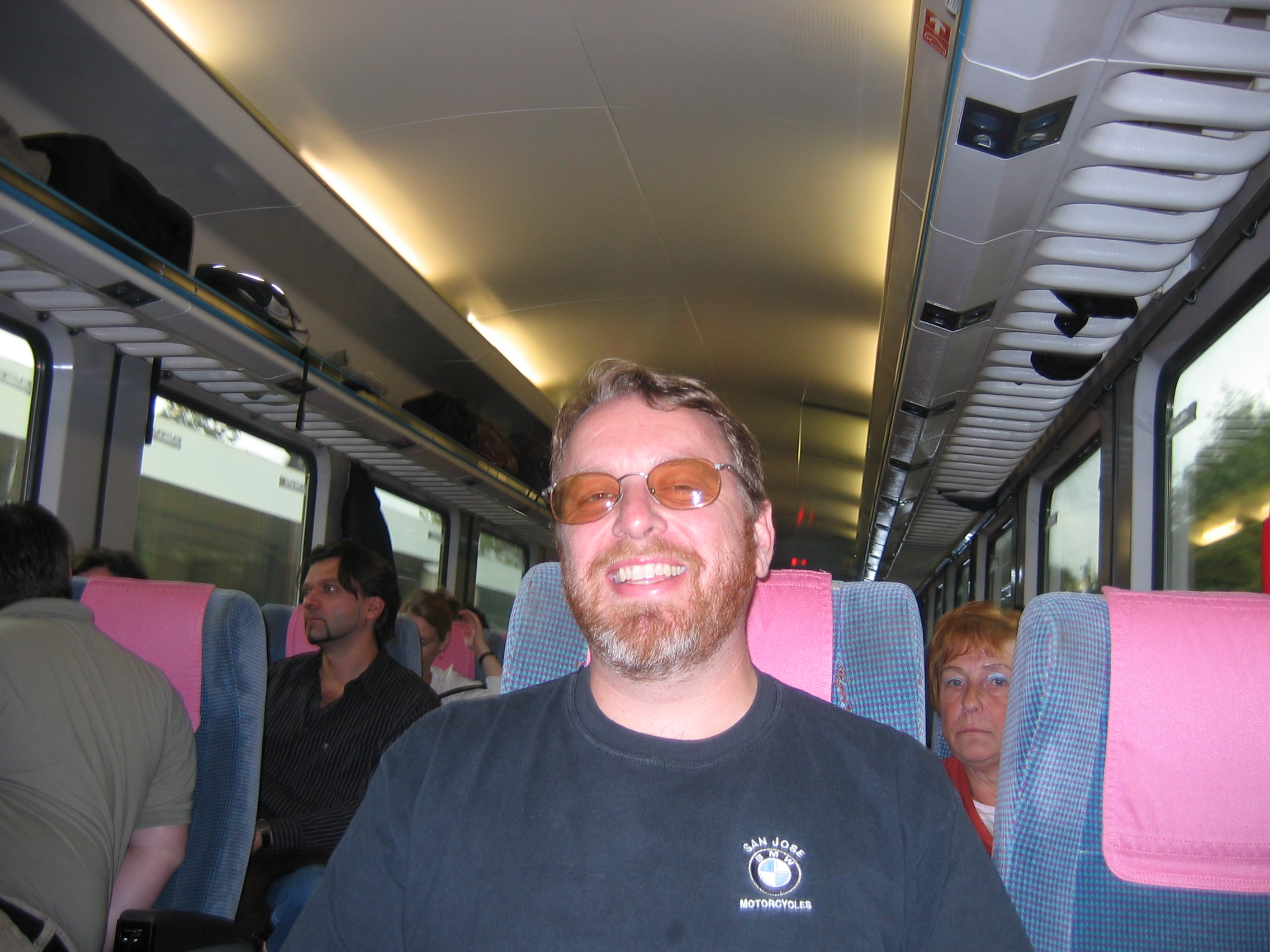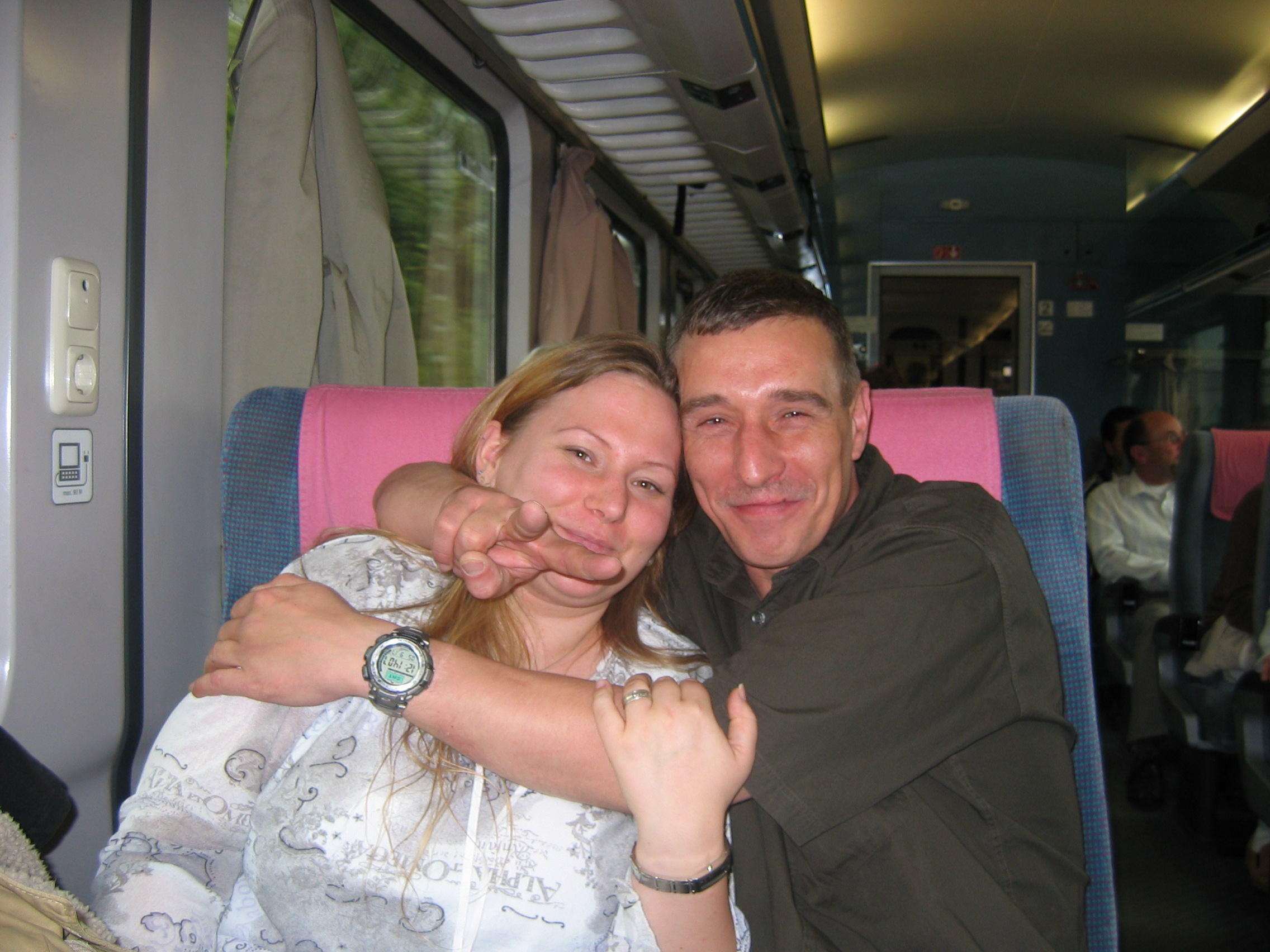 Couple on Train who talked to me and gave me schnapps. Him giving me a hearty handshake and a clenched fist like salute. Kind of a show of strength. Made me happy. Drinking his schnapps later. Even sharing it with the French man who looked like my cousin Baxter. When I got back to the hotel, the Boehlers told me this schnapps is called "Little Coward" - "Kliener Fiegling", which is kind of ironic.