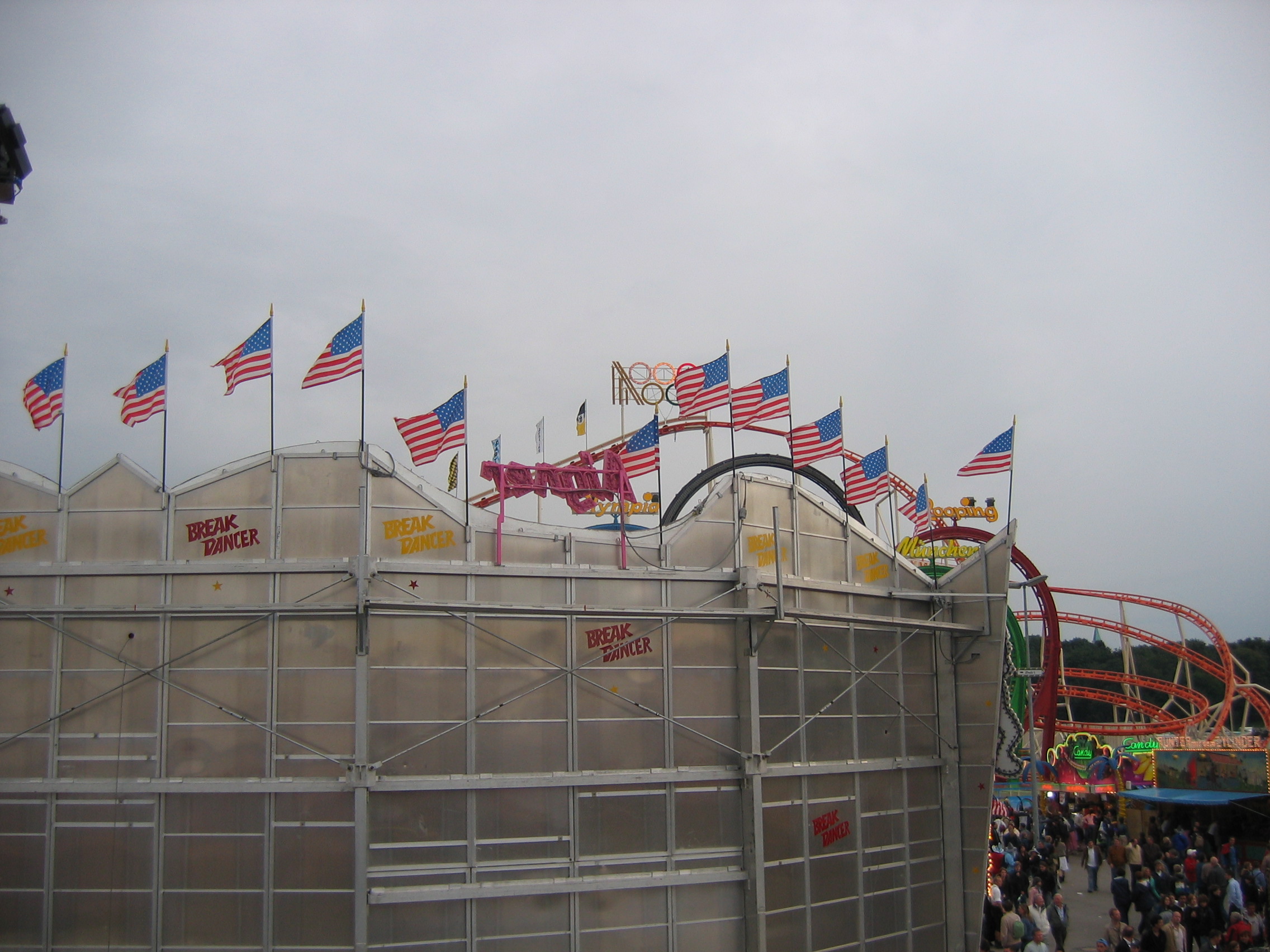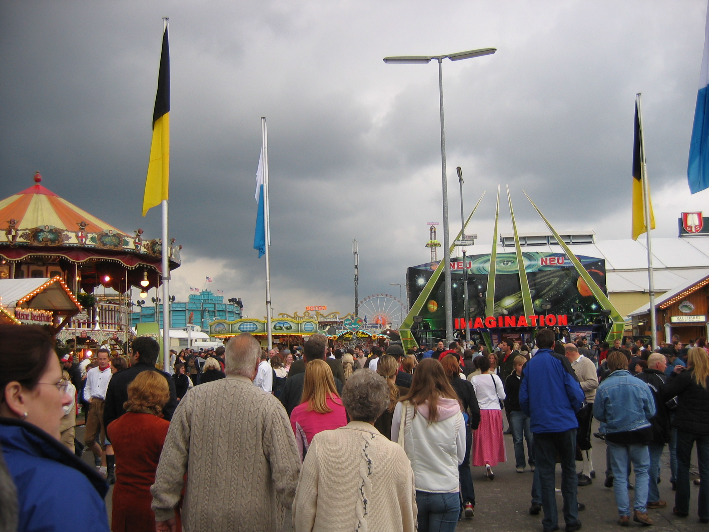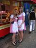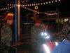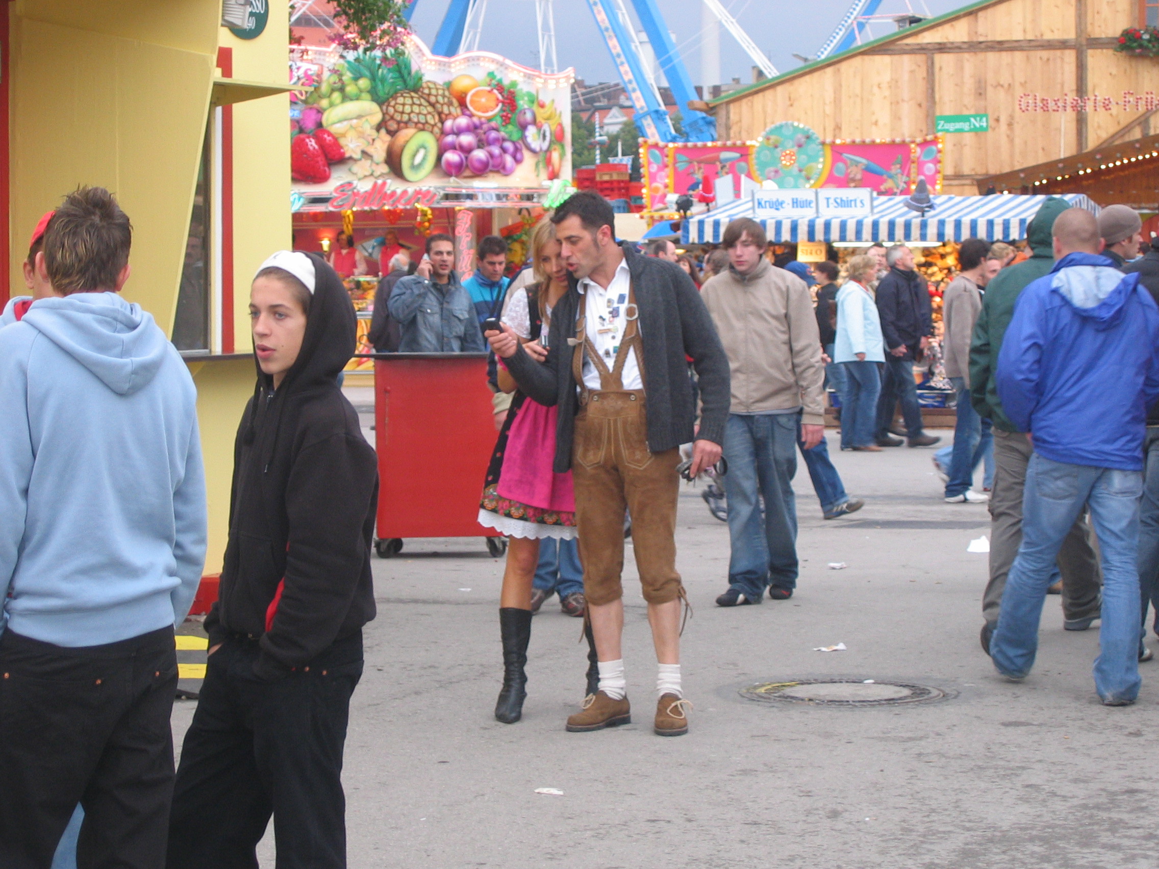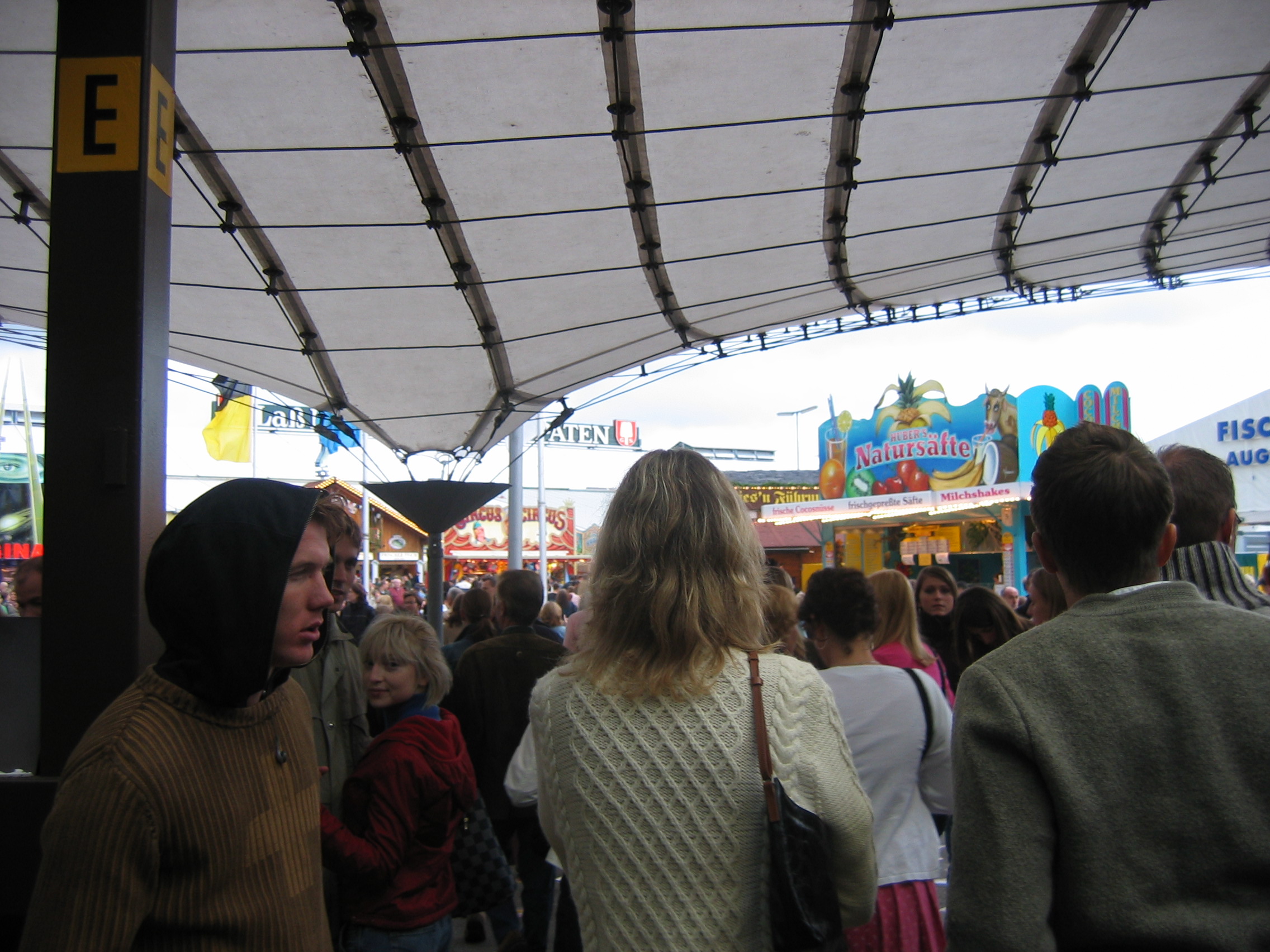 Waiting under the awning with the German lady selling stuffed animals. Seeing the two young men and woman dancing to the sounds of the "disco" ride. Thinking the guy danced good. Kind of like the commericial you see on TV of the guy dancing with the two woman in front of the bar. I think it is a German alcohol commercial.