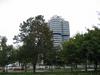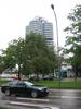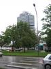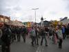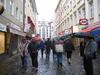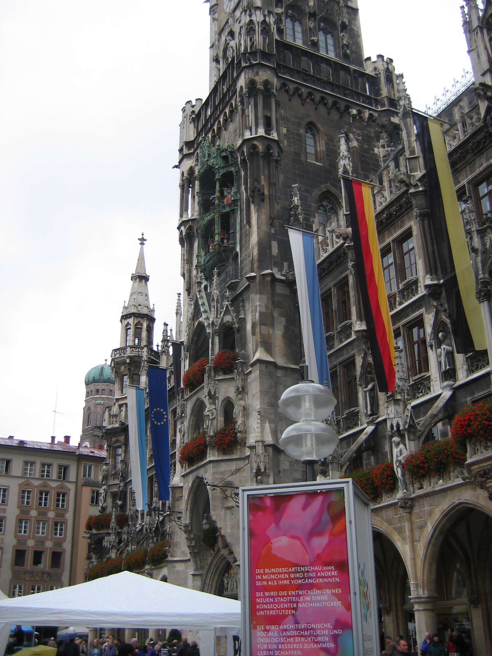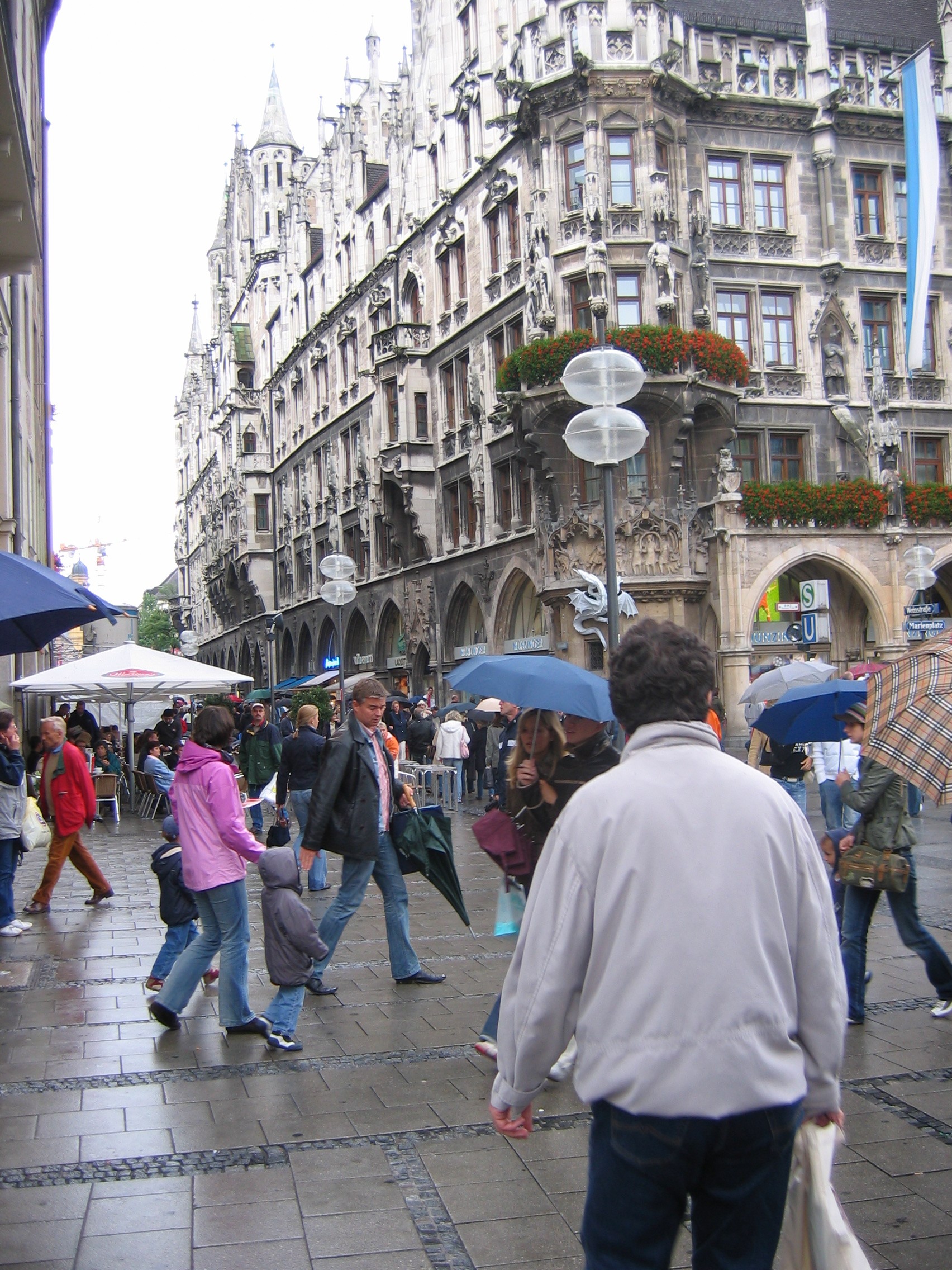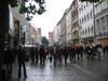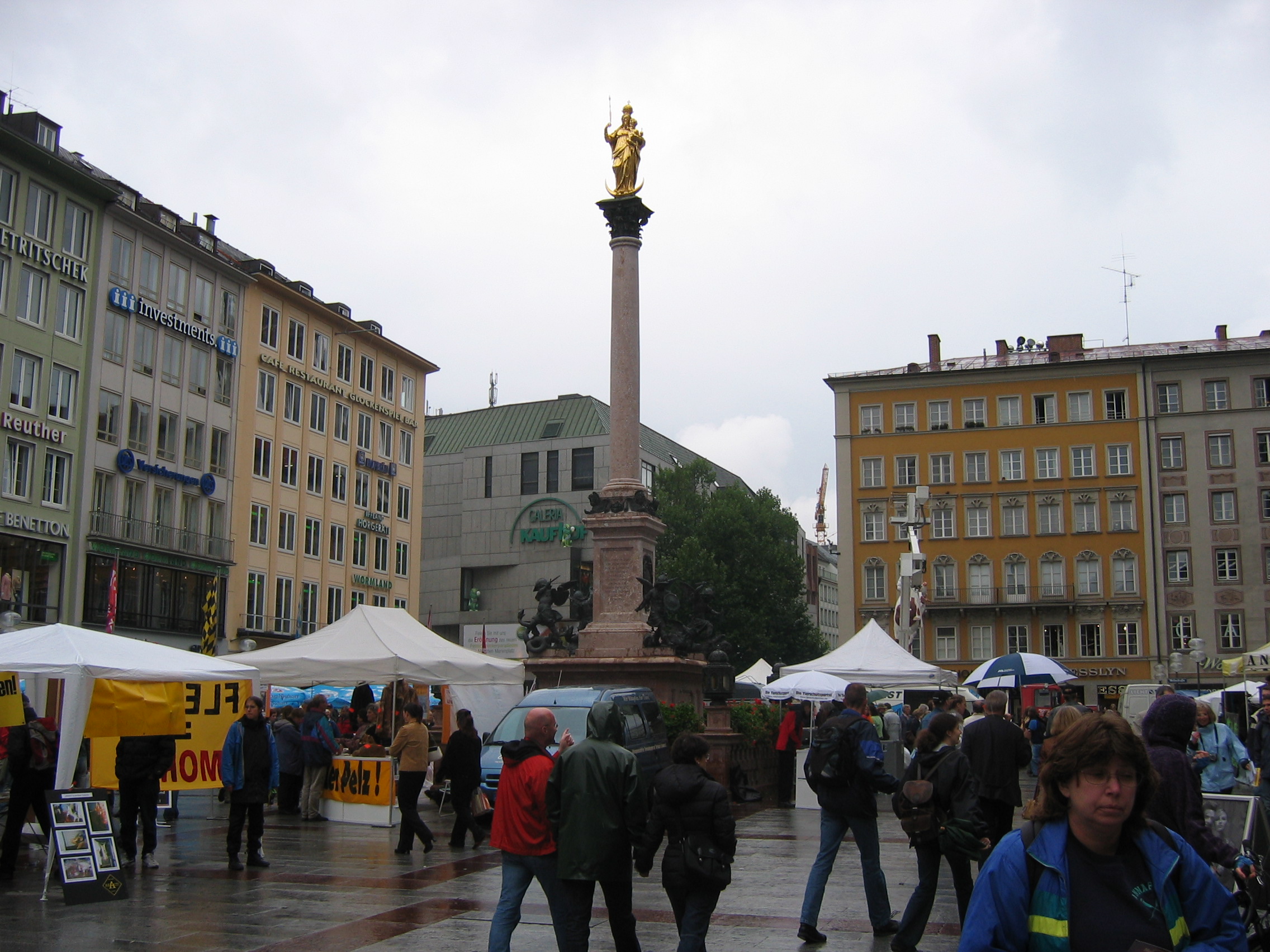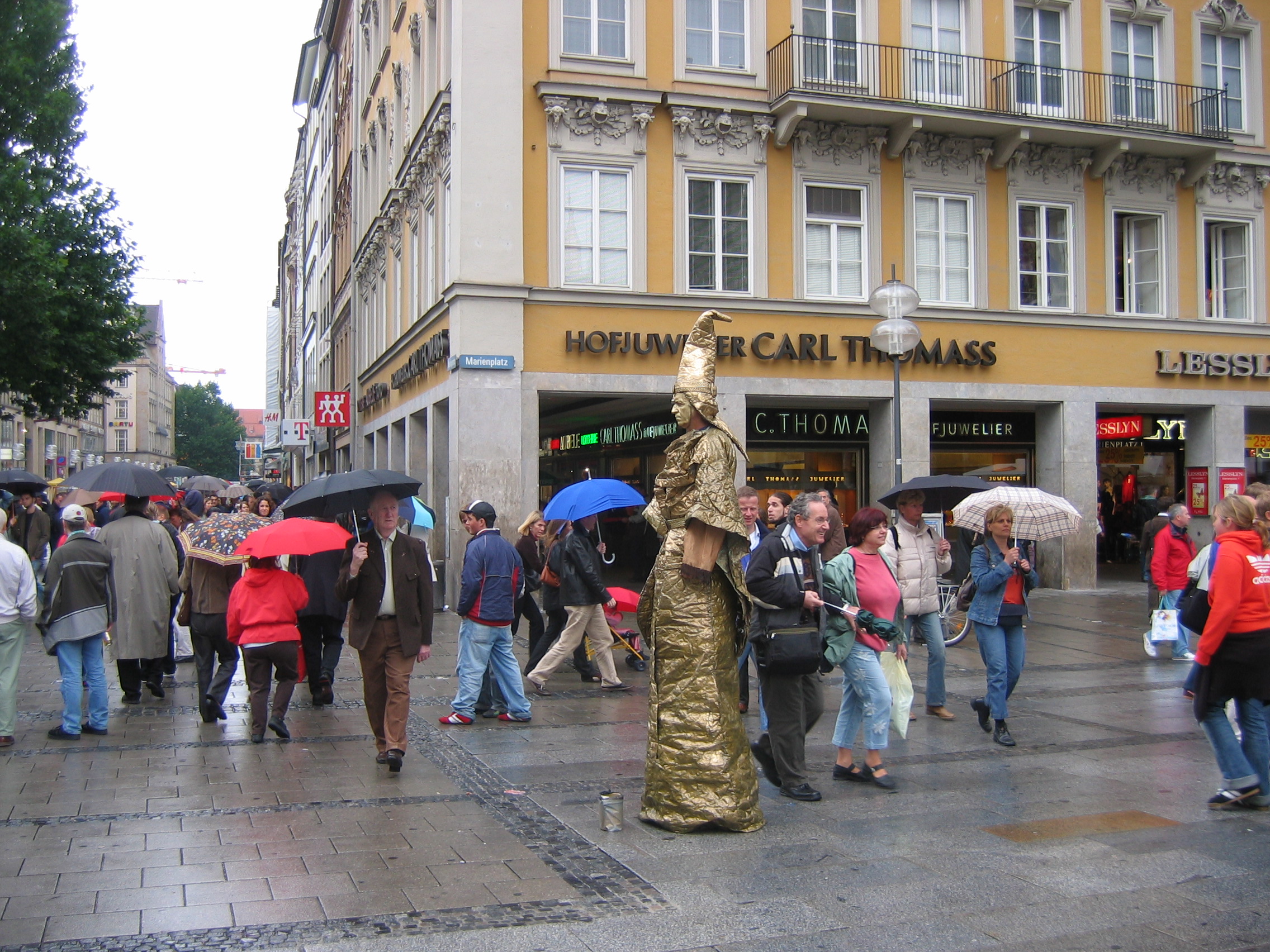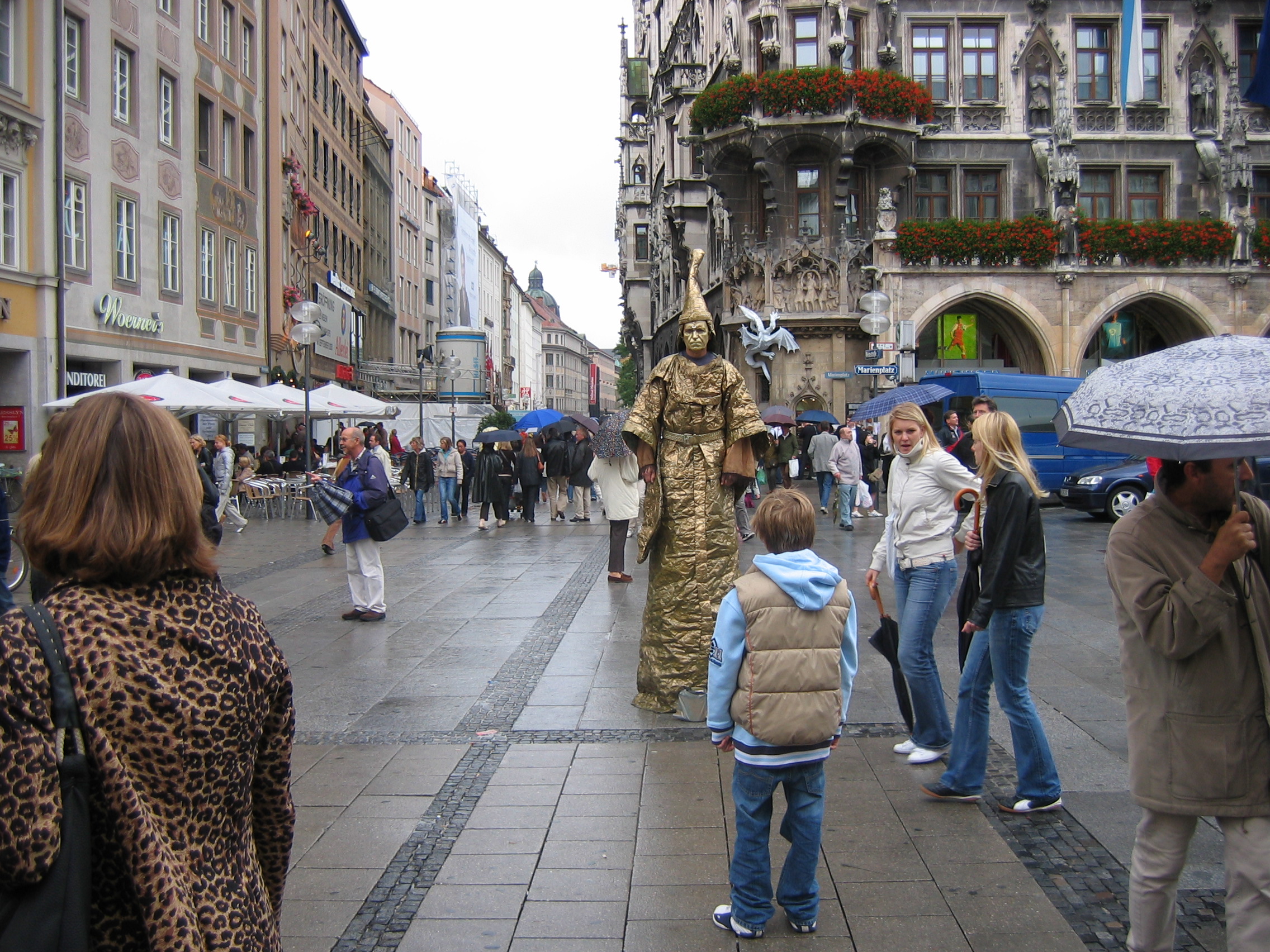 Eating the tofu and other non-meat products at the rathouse(marine platz) in the rain for free. The man on stilts, dressed in robes, and painted gold including face, who just stood there and scowled.