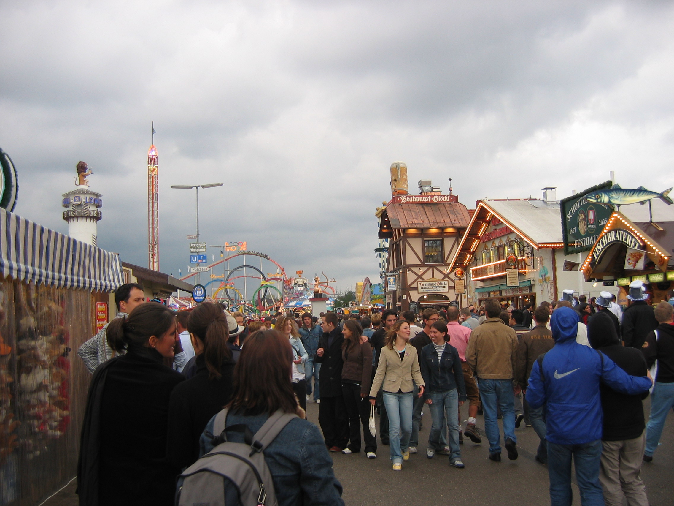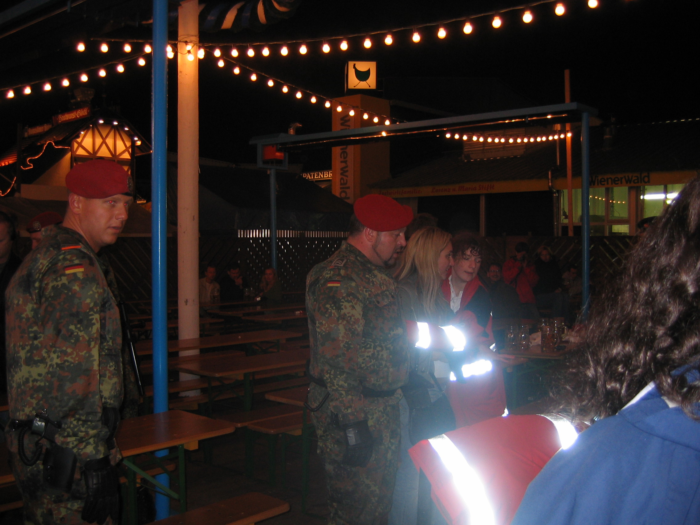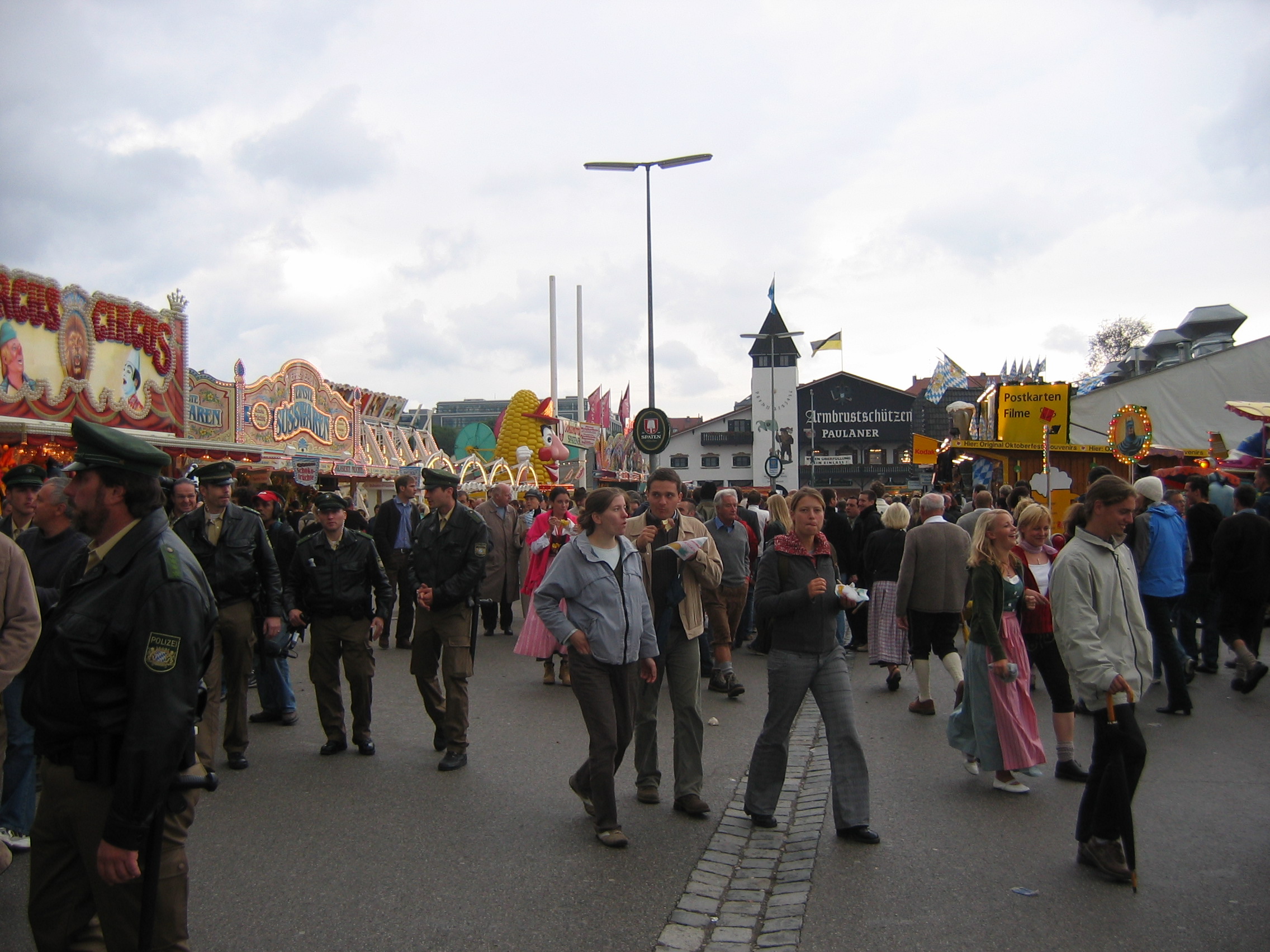 The Australian woman I talked with outside one of the beer gardens while we watched a different drunk getting put in chains. Her needing to find a bathroom. Escorting her to the bathroom. Her telling me about her friend getting her purse stolen in the beer tent. Walking back the same way afterwards and seeing the young drunk being cheerful and talking with the police. His handcuffs removed but the germans writing furiously in their notepads. Thinking I hope he gets out of it without too much trouble.