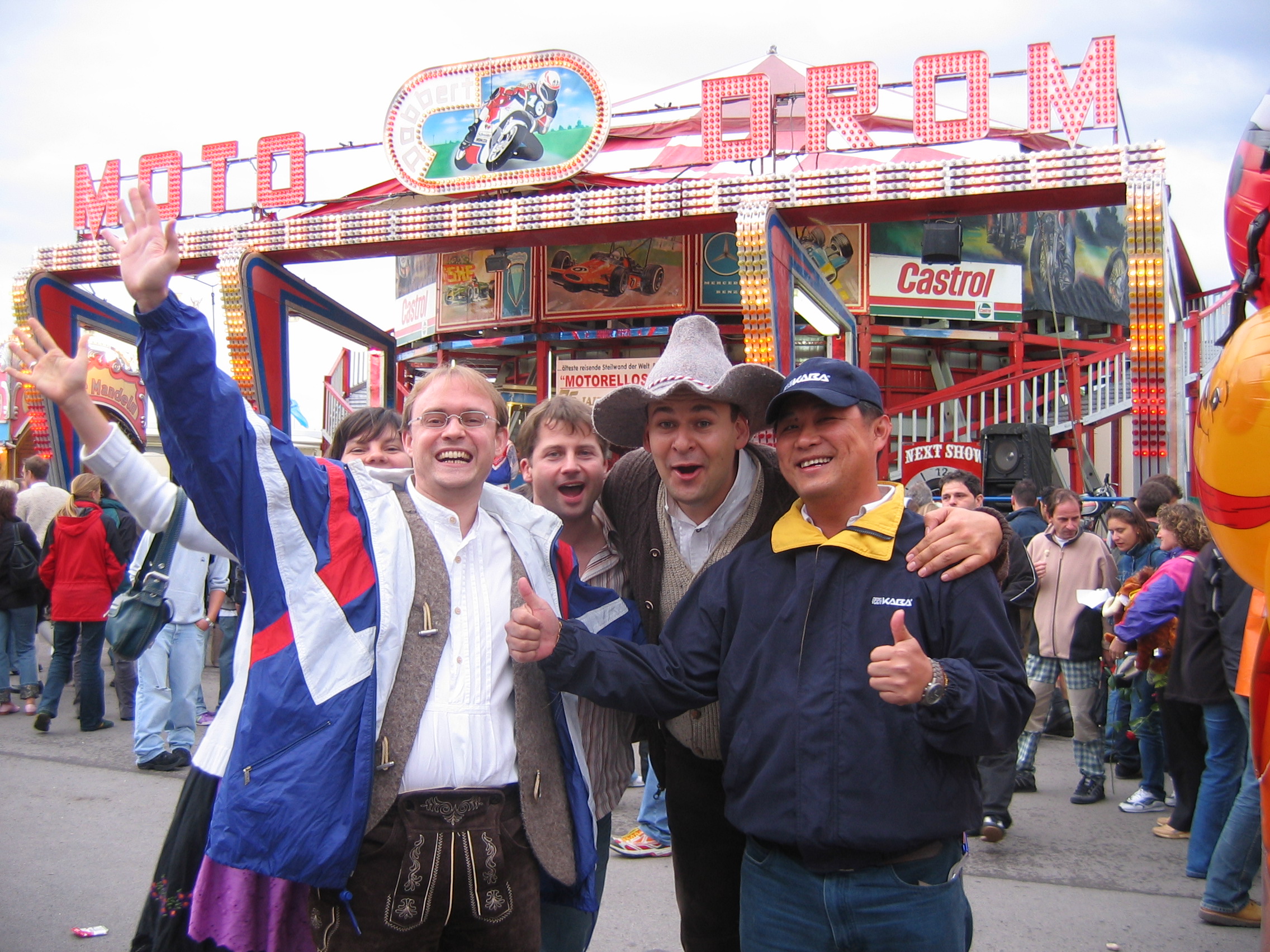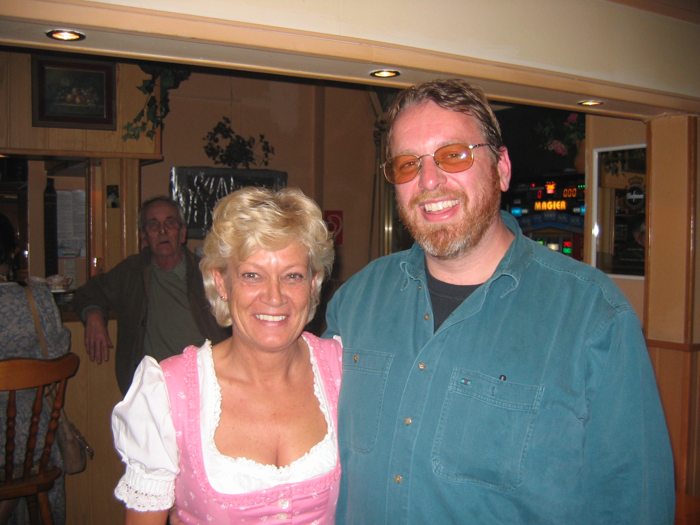 The women wearing the cute bavarian costumes. The chinese woman wearing the costume who posed so well for the camera.