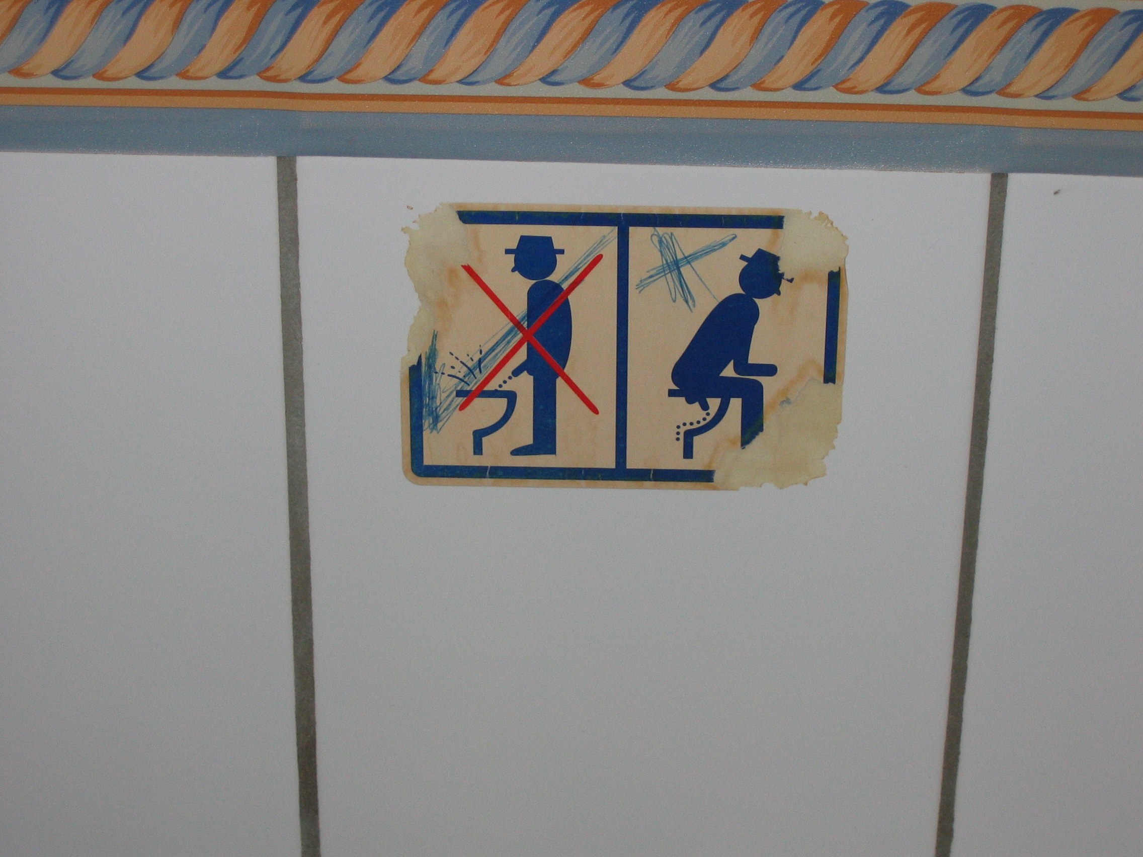 The pub restroom which had the sticker which instructed men should not stand up to pee and instead should sit down like a woman to pee. Actually had an outline of men's gentials including a dashed line for the path of urination.